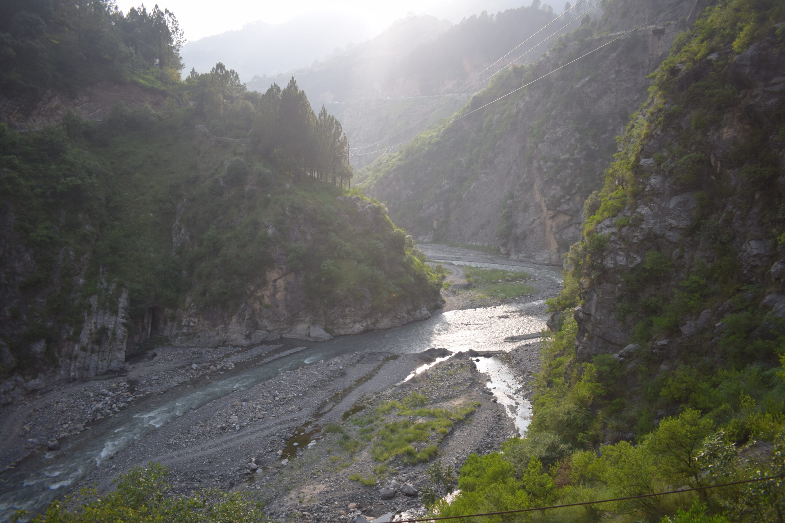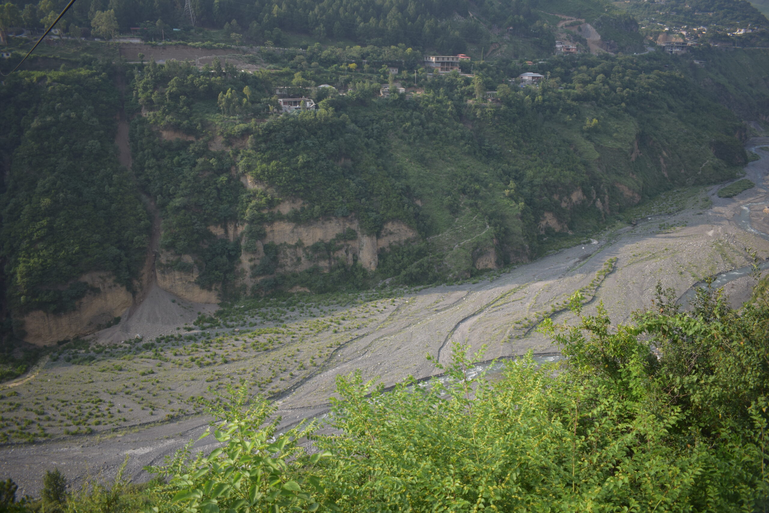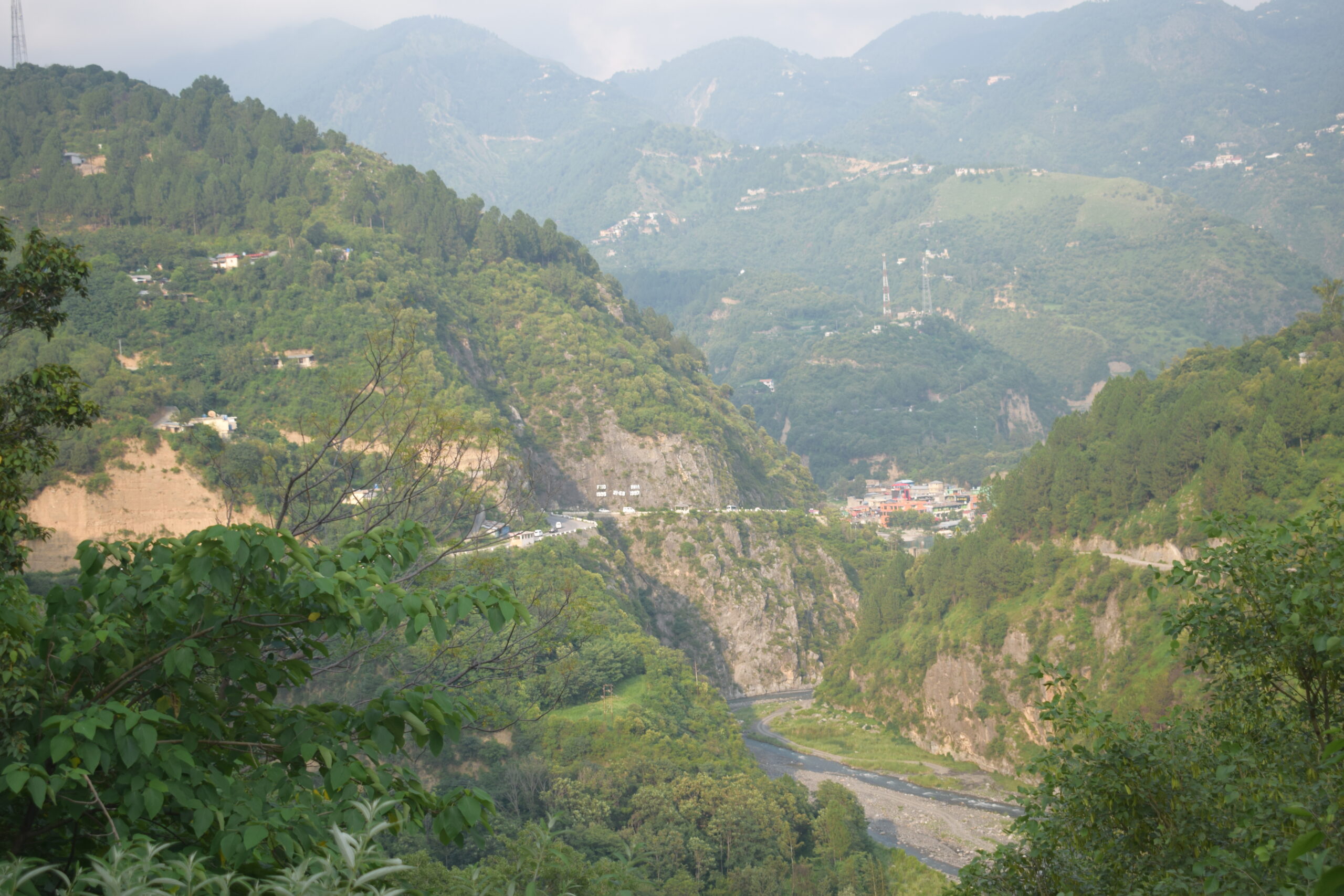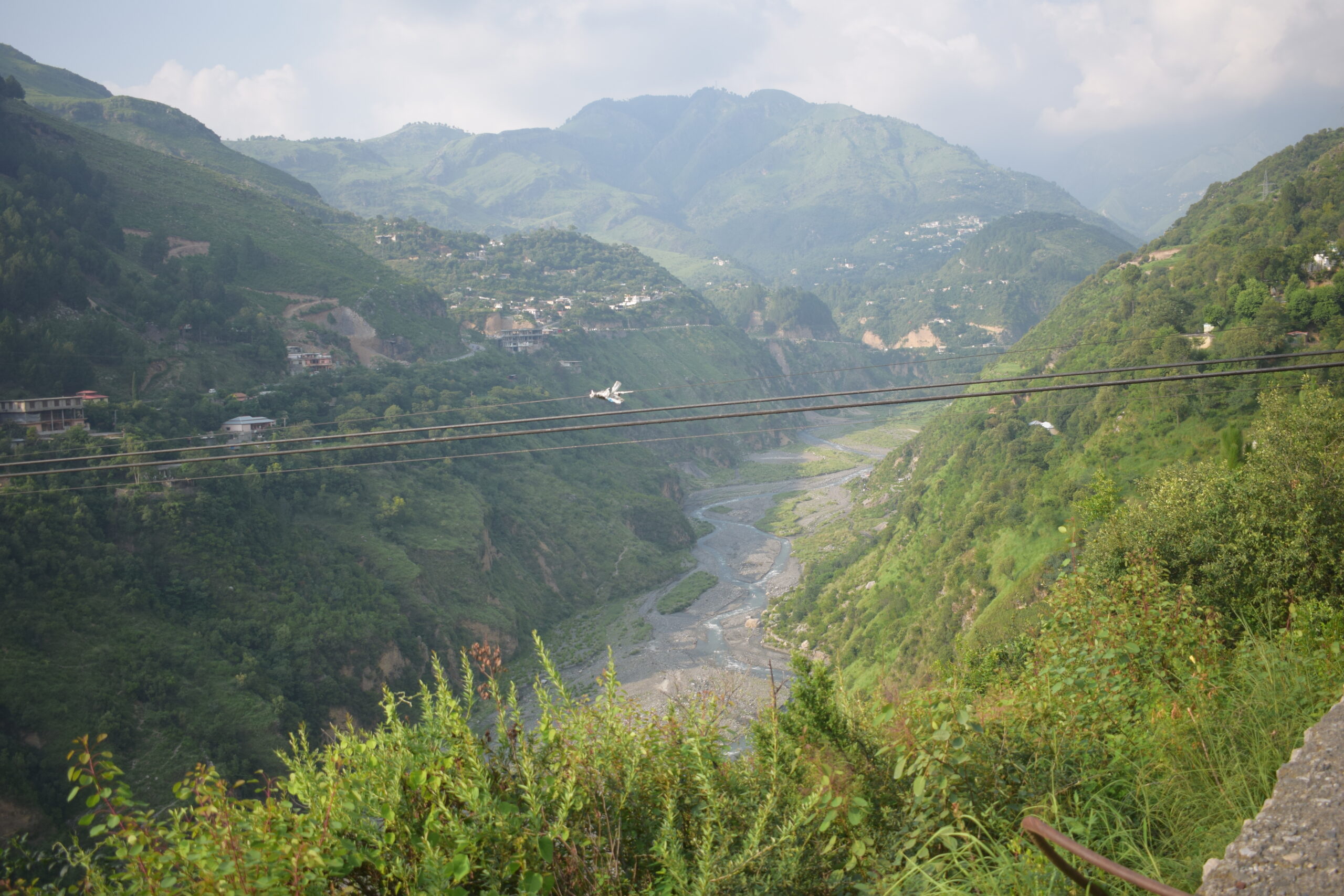 The view along the Nathia Gali road is also a very memorable experience. I followed the Nathia Gali or murre road by leaving the main Karakoram Highway N35 near CMH Abbottabad. After 3 to 4 km from Murre Chowk on Karakoram Highway, you will see a signpost on your left indicating the Thandiani Road turn left. This is Thhandiani Chowk Abbottabad, here you can see the upstream Dor river called Darkhan Katha. Dhamtour is the first big town within 5 km. Dhamtour is a beautiful town spread over both sides of the Nathia Gali road. I stopped for a while just past Dhamtour when I saw a cabin on my right-hand side ziplining over the Harno River.